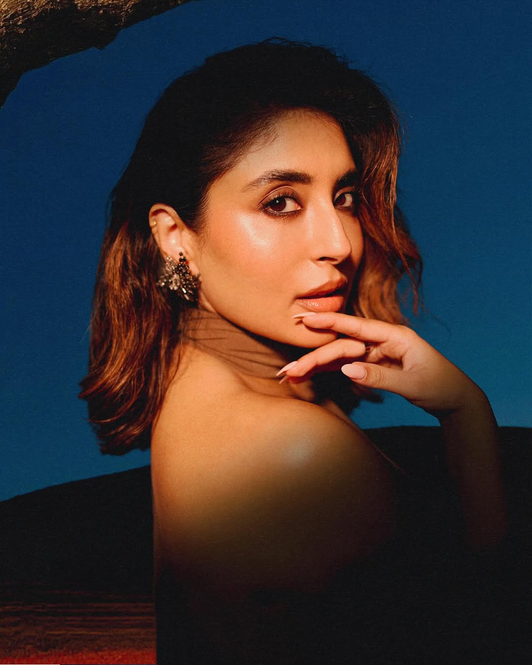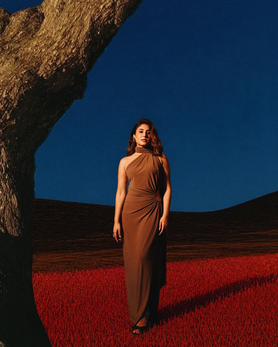 लाल फूलों की चादर और गहरे नीले आसमान का यह कॉन्ट्रास्ट बैकड्रॉप उनके इस डस्की लुक को और भी सिनेमैटिक बना रहा है।